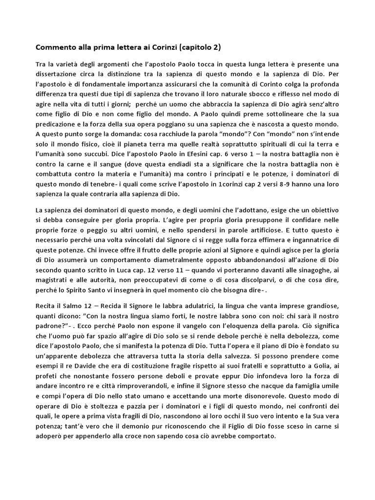 Commento Alla Prima Lettera Ai Corinzi | PDF - Scribd Commento alla prima lettera ai Corinzi (capitolo 2) Tra la variet degli argomenti che lapostolo Paolo tocca in questa lunga lettera presente una dissertazione circa la distinzione tra la sapienza di questo mondo e la sapienza di Dio. Per lapostolo di fondamentale importanza assicurarsi che la comunit di Corinto colga la profonda